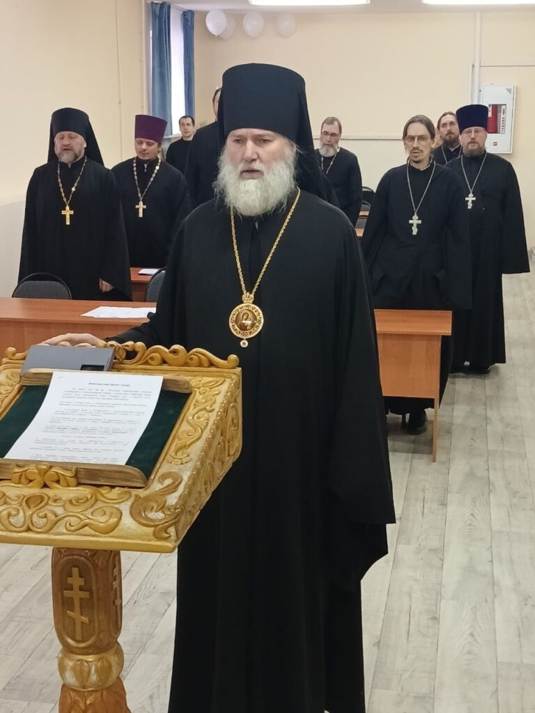 Преосвященный владыка огласил членам собрания повестку предстоящего собрания, посвященную подведению итогов 2025 года, актуальным задачам и проблемам епархиальной жизни, отчитался о служении, посещении вверенных ему приходов и отдаленных от центра селений и поделился планами на предстоящий год.