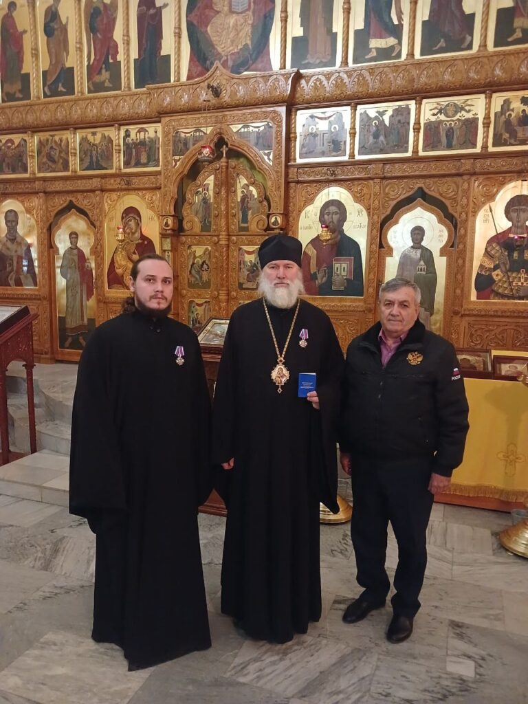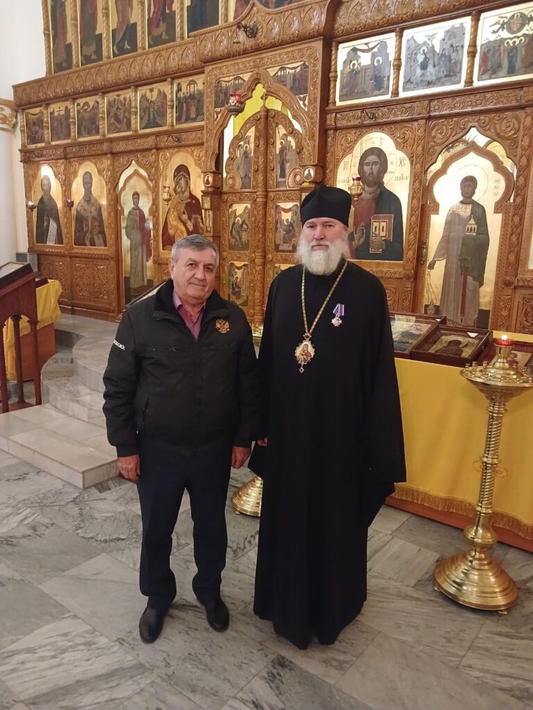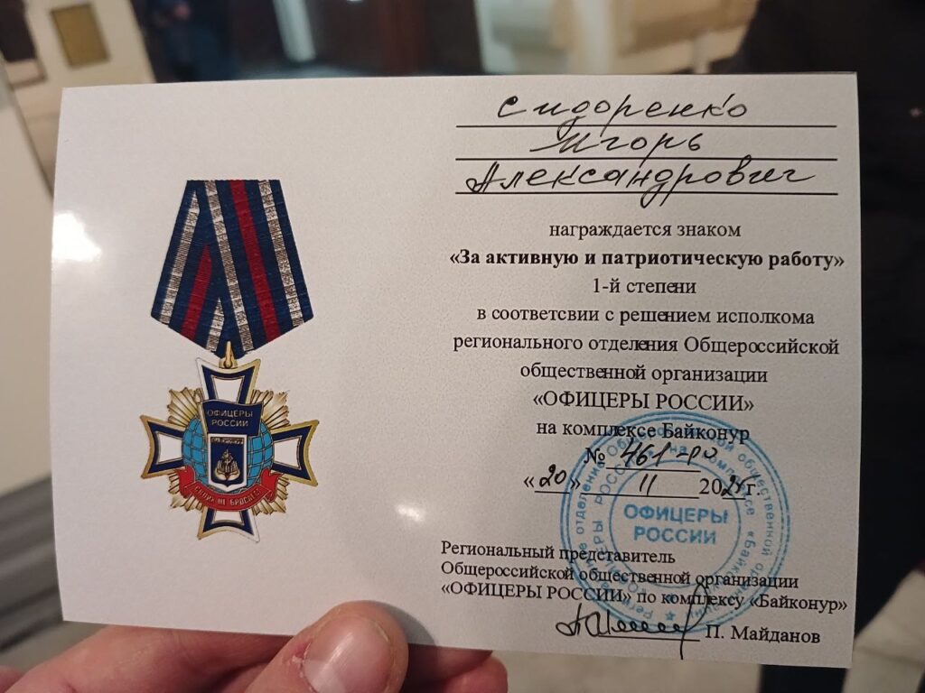 По окончании беседы Исполнительного комитета региональный представитель Общероссийской общественной организации «Офицеры России» по комплексу «Байконур» Майданов Пётр Евгеньевич наградил епископа Игнатия и и.о. настоятеля Свято-Георгиевского храма иерея Даниила Ивашинина знаком «За активную и патриотическую работу» 1 — й степени.