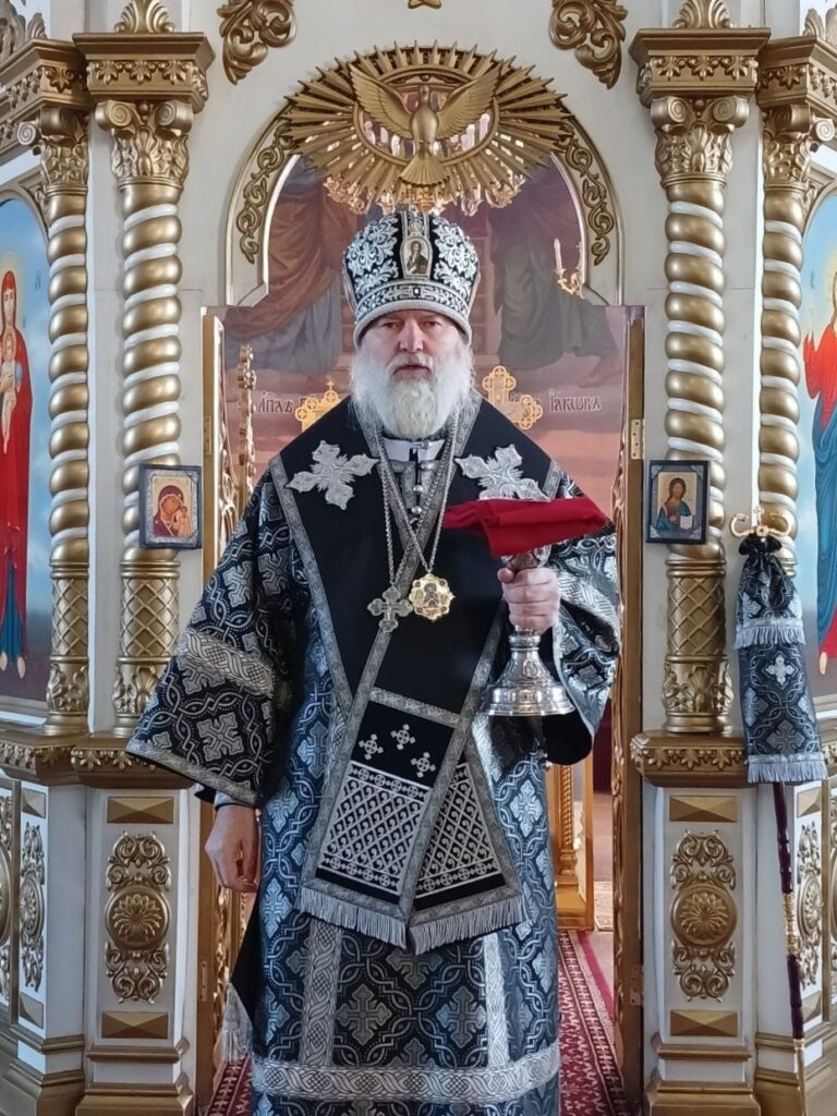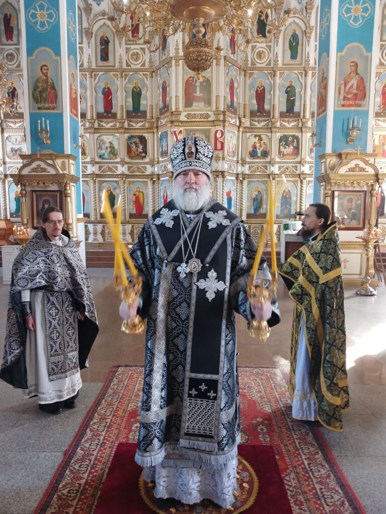 Преосвященному владыке сослужили: ключарь собора иерей Леонид Худяков, иерей Роман Сайтиев, секретарь епархии иерей Борис Фатеев, диакон Сергий Мешков.