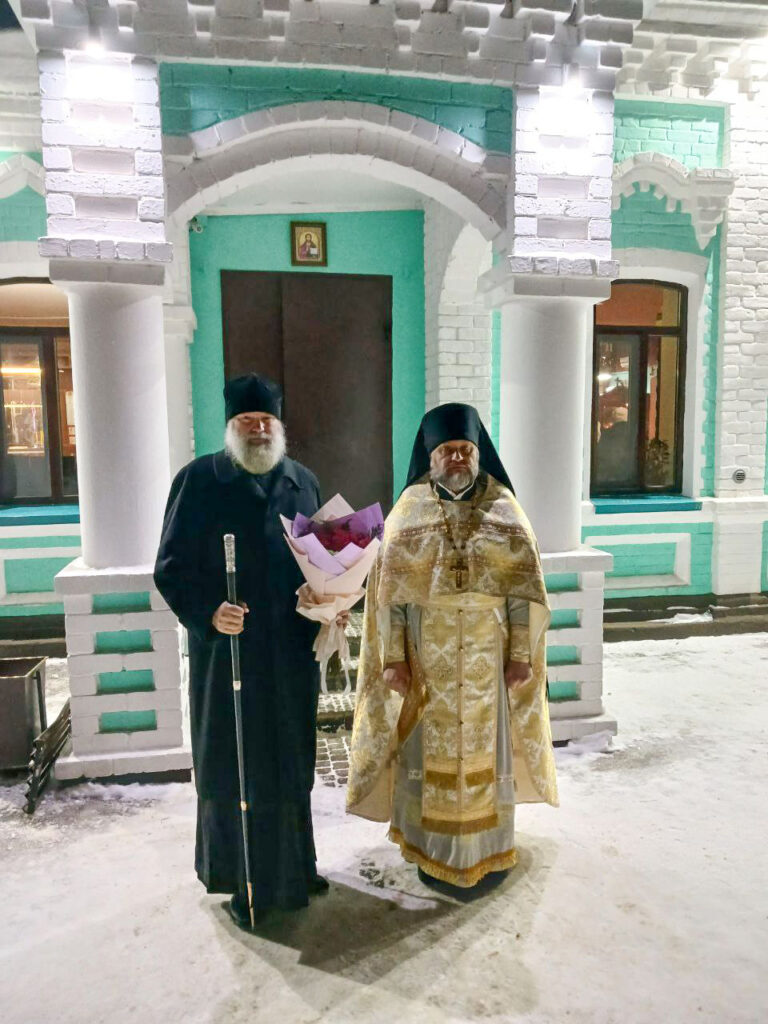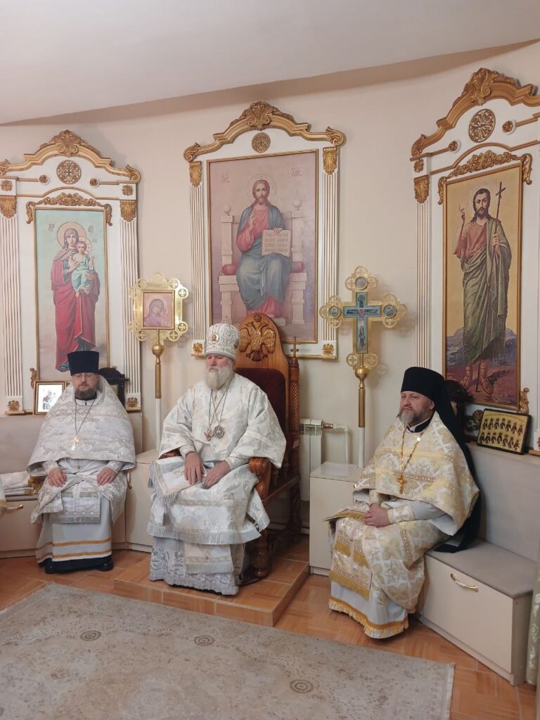 Его Преосвященству сослужили: и.о.благочинный церквей Актюбинского церковного округа, настоятель Михайловского храма иеромонах Киприан (Дахно), клирик Свято-Никольского собора и настоятель храма иконы Божией Матери «Умягчение злых сердец» посёлка Мартук иерей Владимир Волощук, диакон Сергий Мешков.