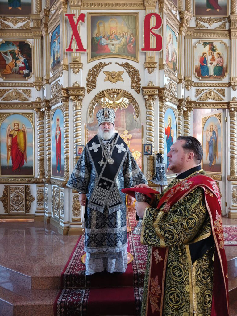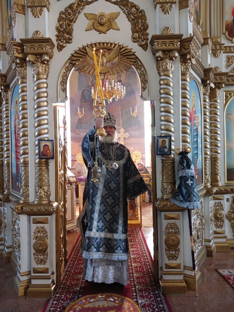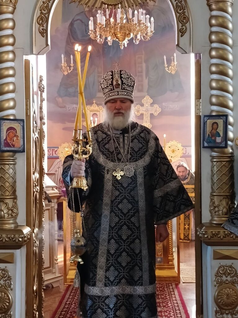 Преосвященному владыке сослужили: ключарь собора иерей Леонид Худяков, иерей Роман Сайтиев, секретарь епархии иерей Борис Фатеев, диакон Сергий Мешков.