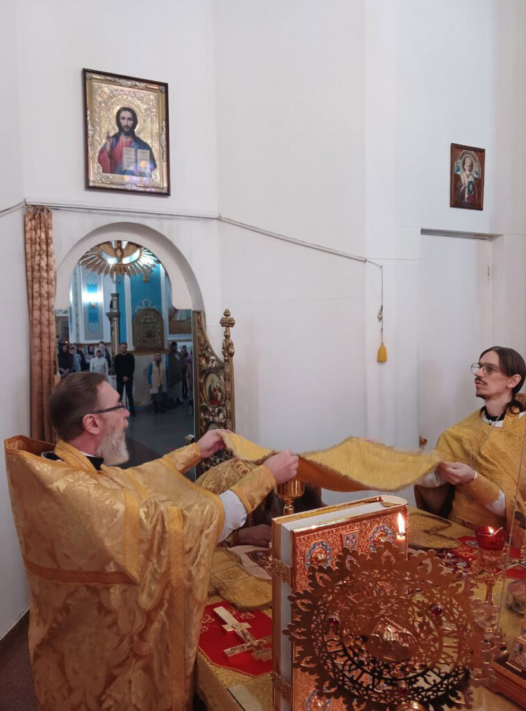 Управляющему епархии сослужили: ключарь собора иерей Леонид Худяков, руководитель отдела по социальной работе иерей Роман Сайтиев, секретарь епархии иерей Борис Фатеев.