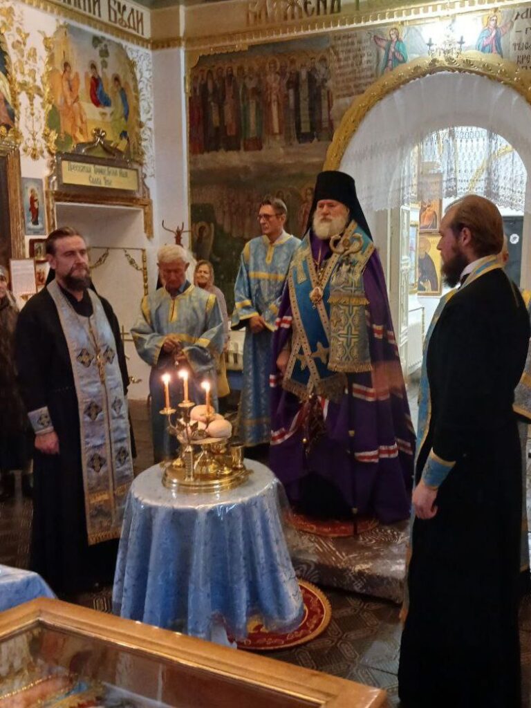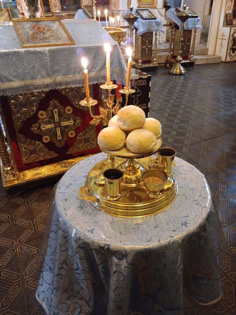 По церковному Уставу была совершена лития с освящением хлеба, елея, вина и пшеницы.