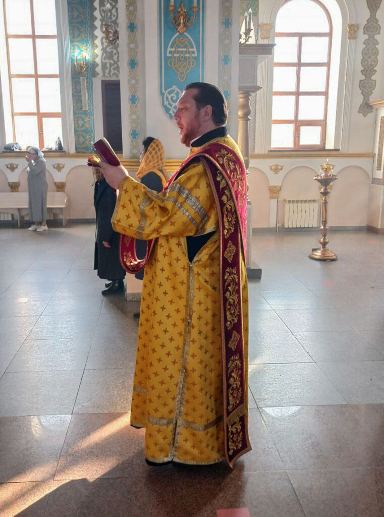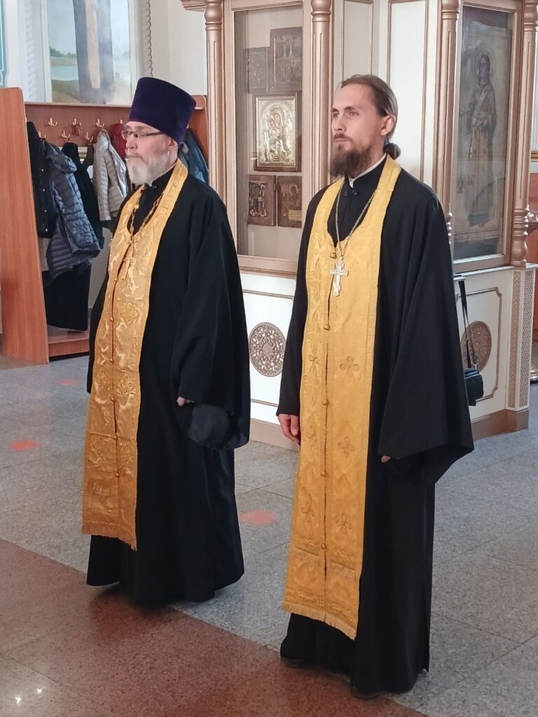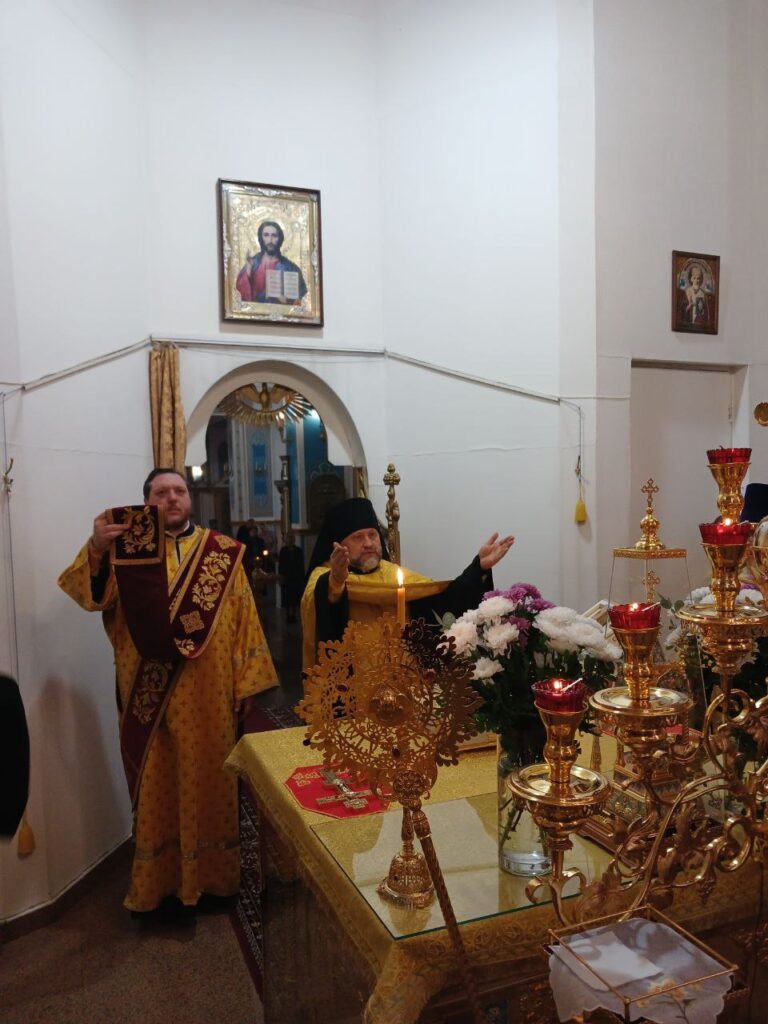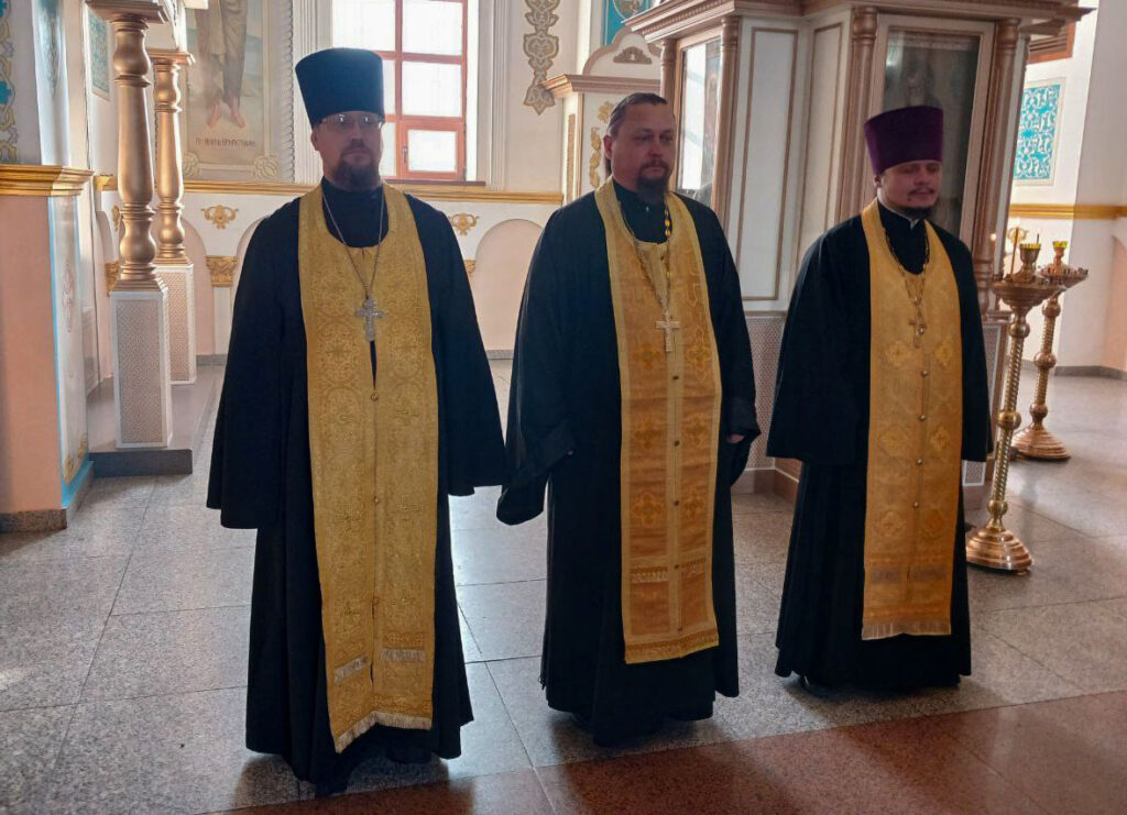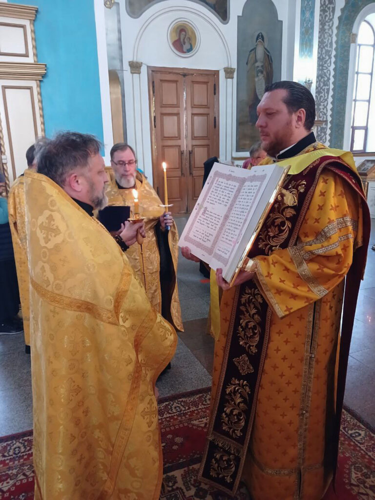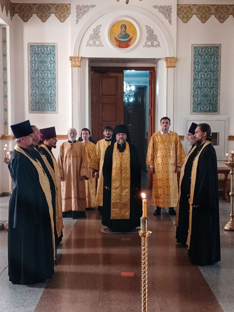 Праздничное вечернее богослужение совершили: и.о. благочинный Актюбинского церковного округа, настоятель Михайло-Архангельского храма иеромонах Киприан (Дахно), настоятель храма в честь святого князя Владимира протоиерей Димитрий Соловьёв, настоятель храма во имя мученика Иоанна воина посёлка Сады Придонья, Волгоградской области иерей Анатолий Омельченко, ключарь Свято-Никольского собора иерей Леонид Худяков, настоятель храма иконы Божией Матери «Умягчение злых сердец» посёлка Мартук иерей Владимир Волощук, клирики собора иерей Роман Сайтиев, диакон Сергий Мешков.