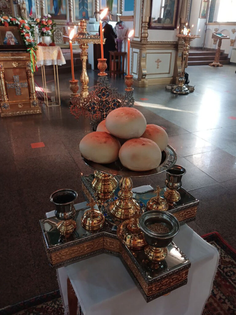 По церковному Уставу была совершена лития с освящением хлеба, елея, вина и пшеницы.