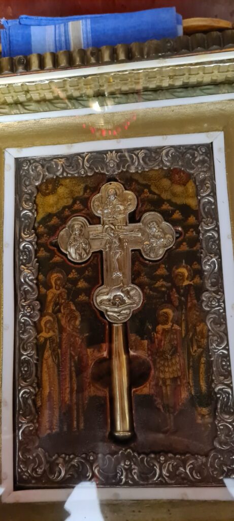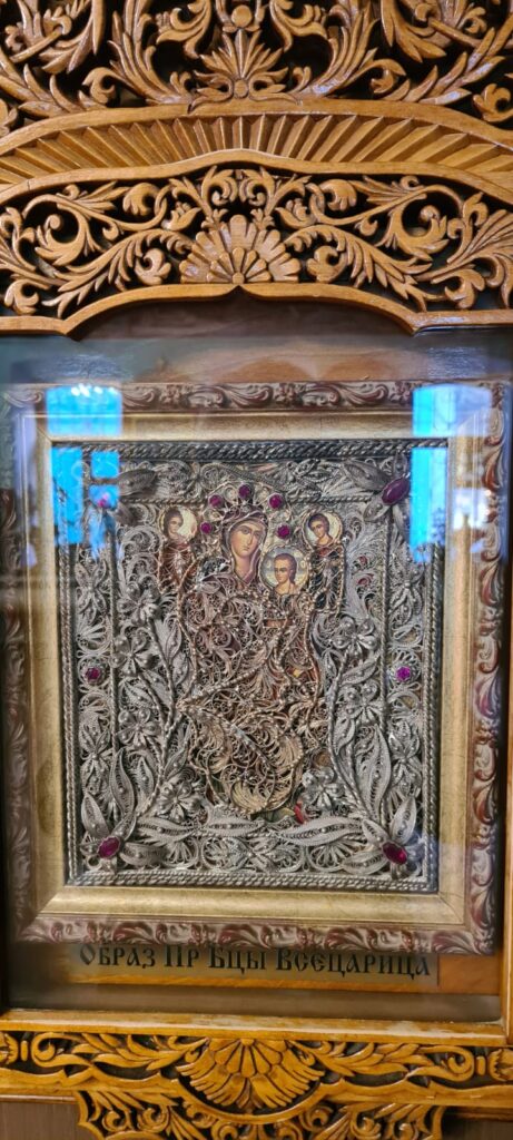 Икона Божией Матери «Всецарица», которой молятся об исцеление онкологических заболеваний. На иконе риза изготовлена из золота и серебра, которое пожертвовали благодарные исцелившиеся прихожане.