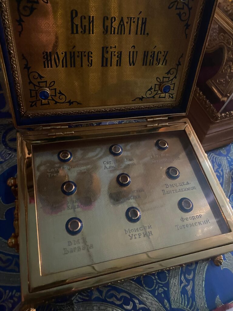 Мощевик с частицами : святитель Спиридон Тримифунтский, святитель Николай Алматинский, святитель Игнатий Брянчанинов, священномученик Макарий митрополит Киевский, великомученик Димитрий Солунский, великомученик Пантелеимон, Великомученица Варвара, преподобный Моисей Угрин, преподобный Феодор Тотемский.