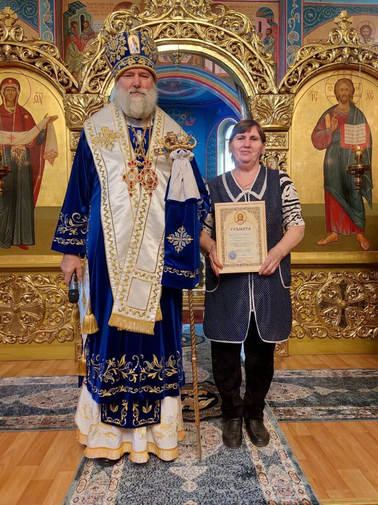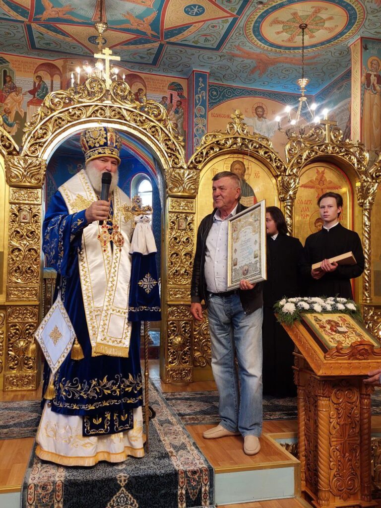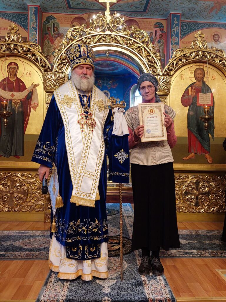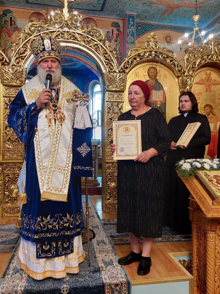 Далее епископ Игнатий отметил архиерейской грамотой Грачева В.М. руководителя ДСУ-13 города Есик в благодарность за помощь в благоустройстве прихрамовой территории, а также благодарственными грамотами сотрудников прихода: Мохову Л., Пархоменко Н., Висельскую Т., Набокина Г. в благословение за усердные труды во славу Святой Церкви.