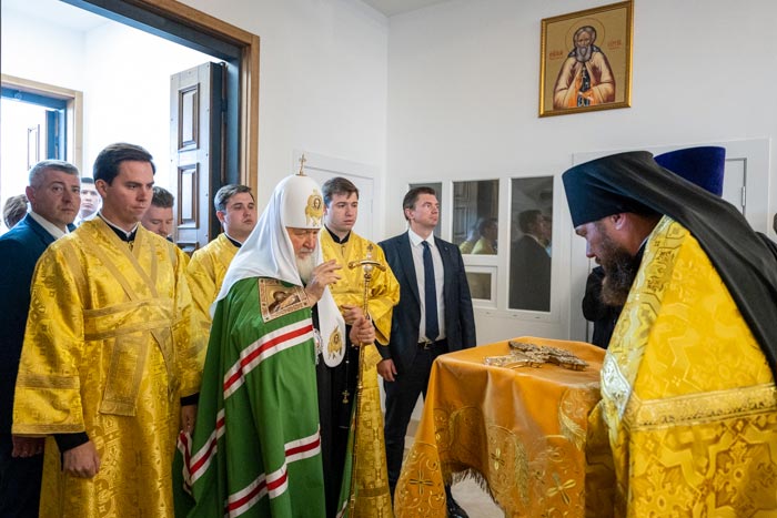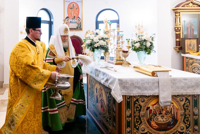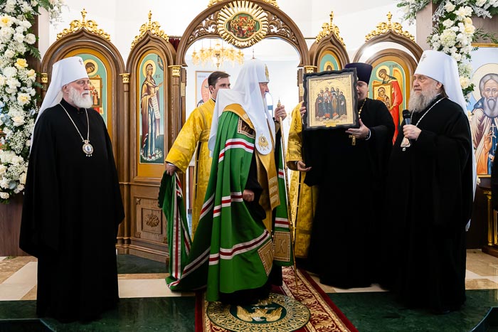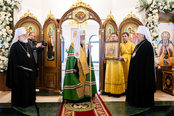 В дар новоосвященному храму Святейший Владыка передал икону с изображением Пресвятой Троицы, написанную по образцу «Троицы» преподобного Андрея Рублева.