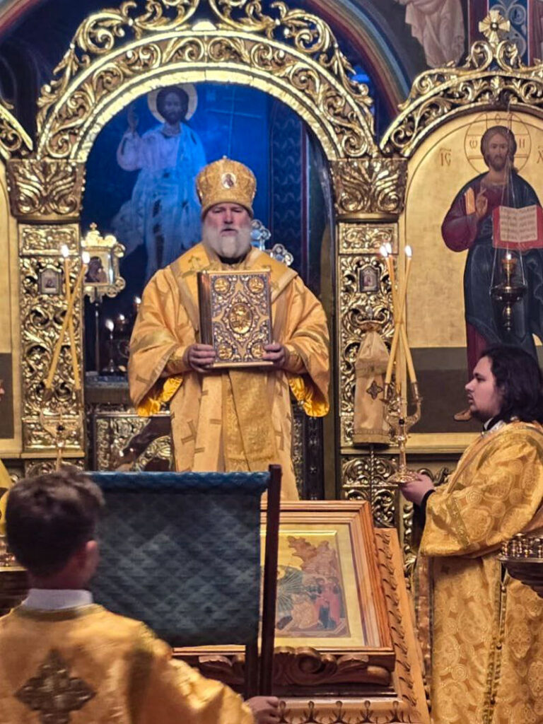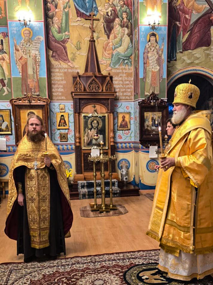 8 ноября 2025 года. Епископ Актюбинский и Кызылординский Игнатий совершил всенощное бдение накануне воскресного дня в Покровском храме города Есик, Алматинской области в сослужении клирика архиерейского подворья иеромонаха Амвросия (Дудонова).