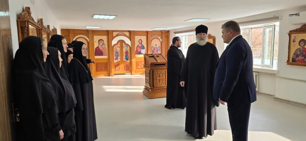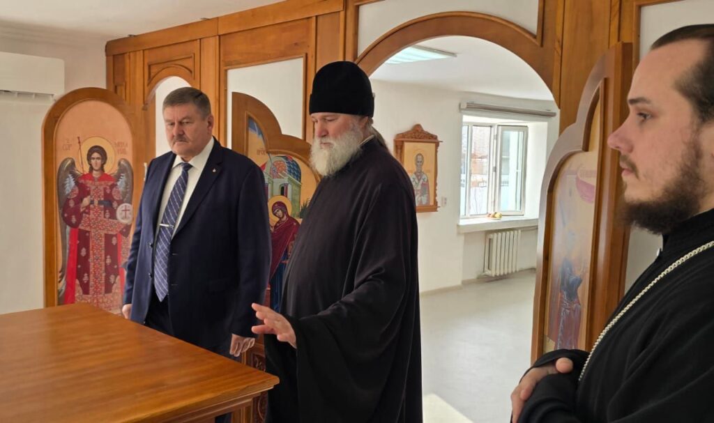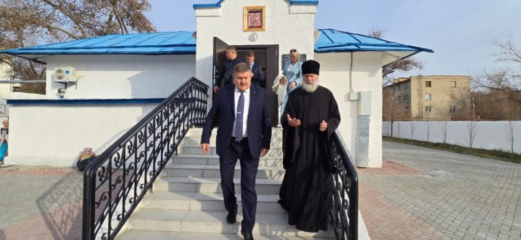Мэр города Байконур тепло поприветствовал гостей. Далее Управляющий епархии представил Константину Дмитриевичу новоустановленный иконостас и алтарную утварь в отреставрированном здании старого храма, подготовленного под дальнейшее пребывание монахинь.