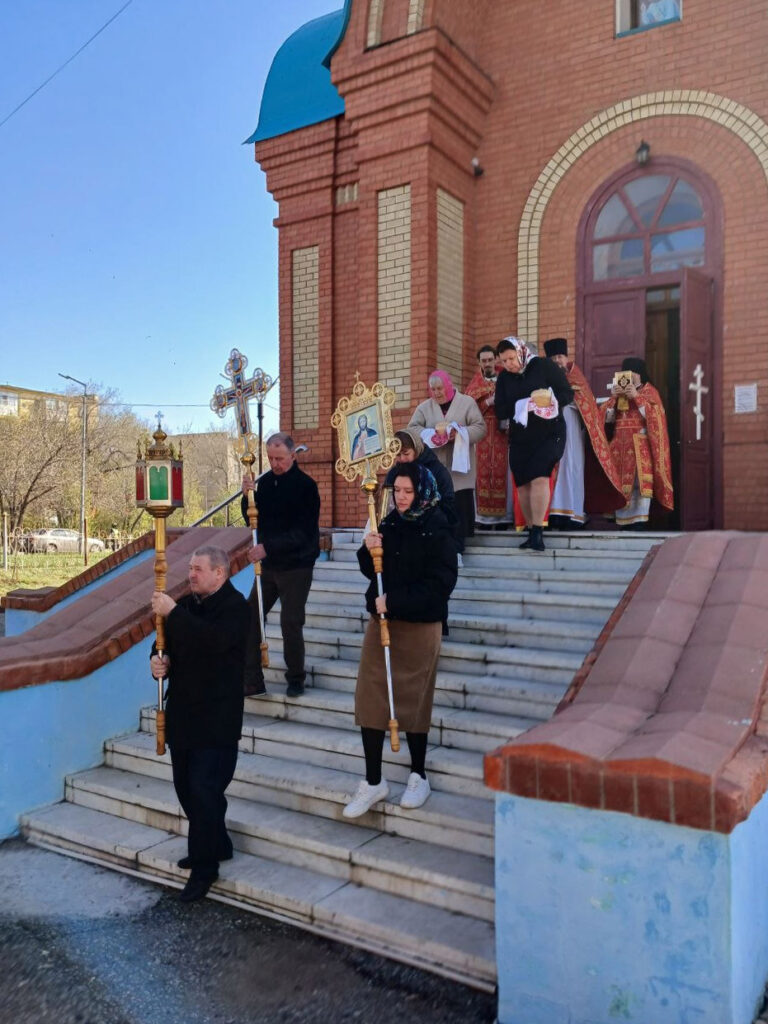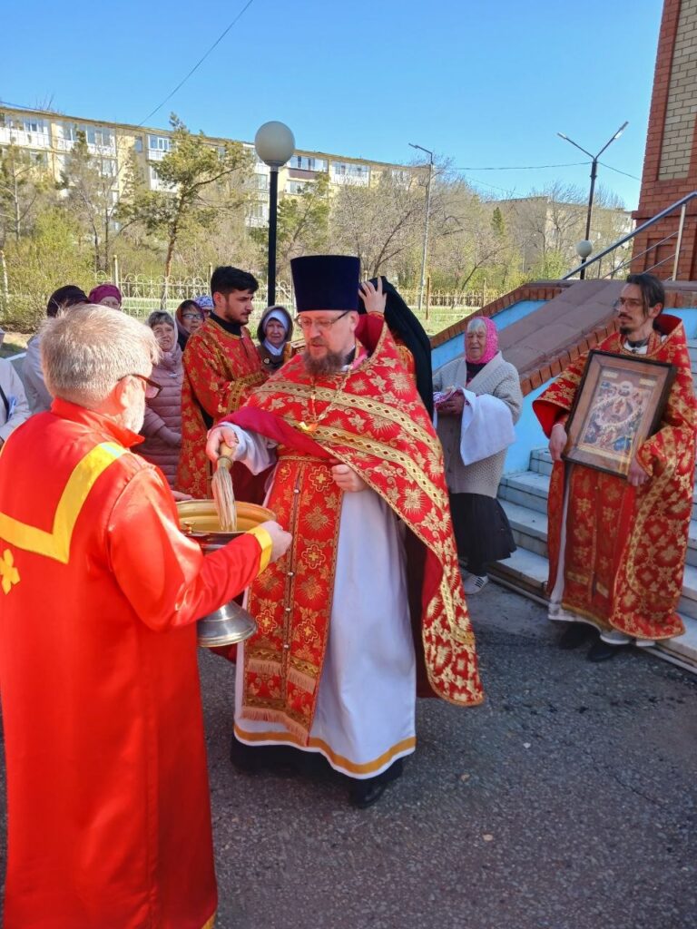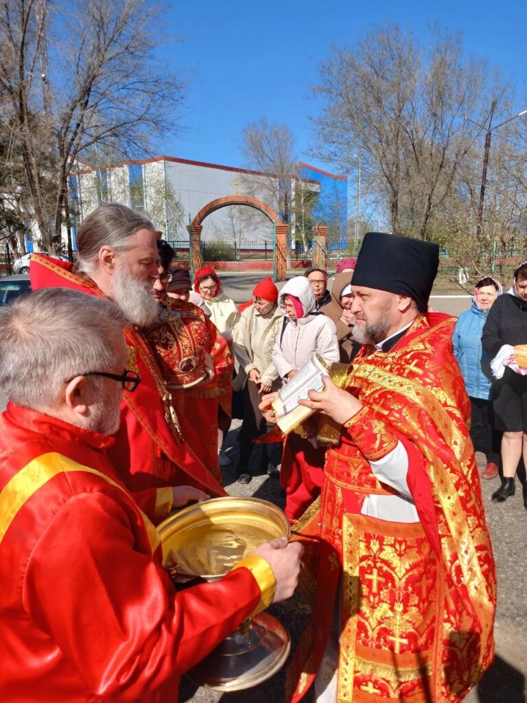 В окончании общей молитвы состоялся крестный ход вокруг храма с пением тропаря Пасхи и чтением Евангелия. Владыка Игнатий и священнослужители окропили верующих святой водой.