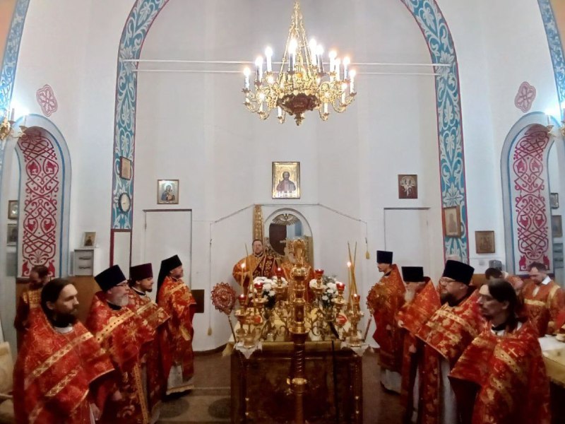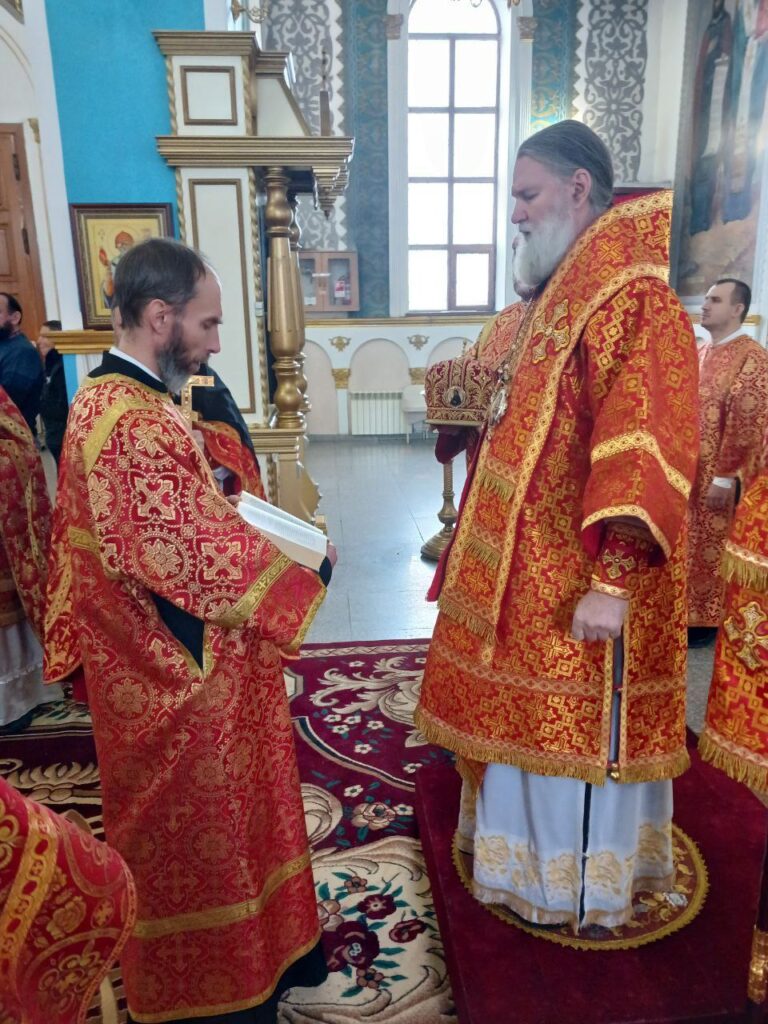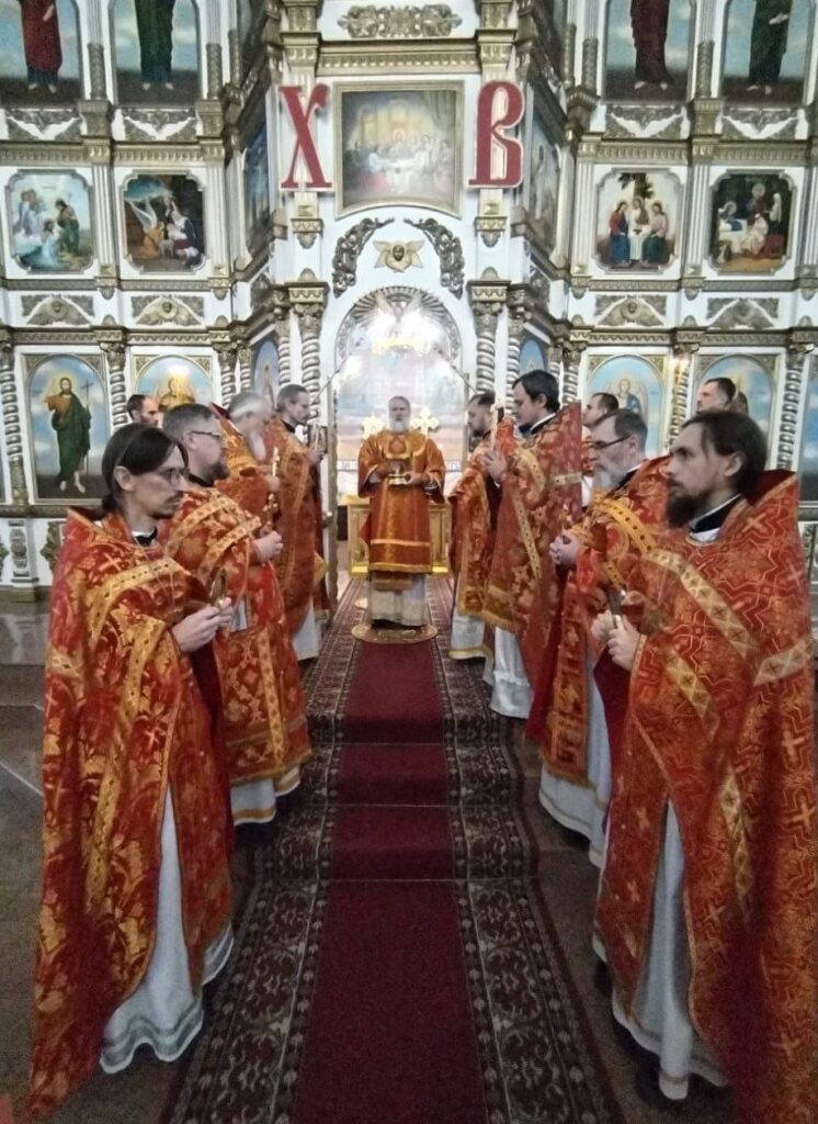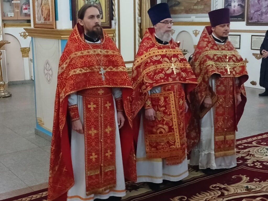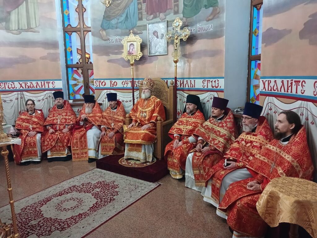 Его Преосвященству сослужили: и.о.благочинный церквей Актюбинского церковного округа, настоятель храма Архангела Михаила города Актобе иеромонах Киприан (Дахно), настоятель храма святого равноапостольного князя Владимира протоиерей Димитрий Соловьёв, настоятель храма в честь преподобного Серафима Саровского города Хромтау протоиерей Михаил Степанов, настоятель Свято — Троицкого храма города Алга иерей Виктор Яцко, ключарь Свято-Никольского собора иерей Леонид Худяков, клирик Свято-Никольского собора и настоятель храма иконы Божией Матери «Умягчение злых сердец» посёлка Мартук иерей Владимир Волощук, клирики собора иерей Роман Сайтиев, секретарь епархии иерей Борис Фатеев, диакон Сергий Мешков.