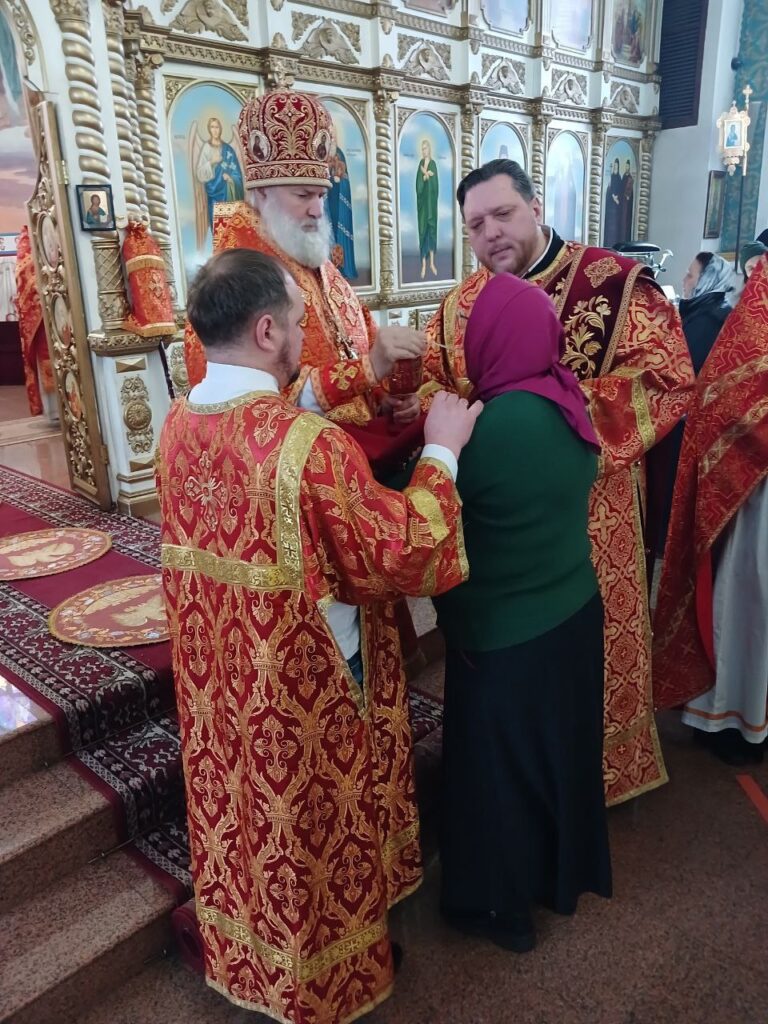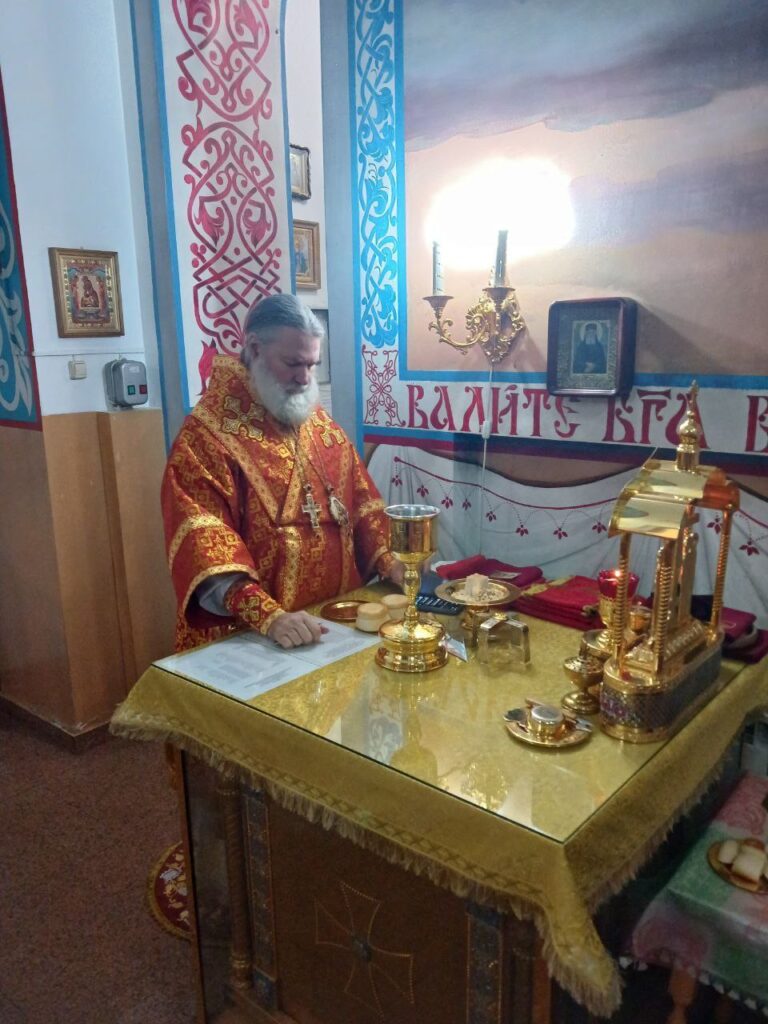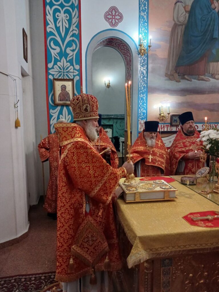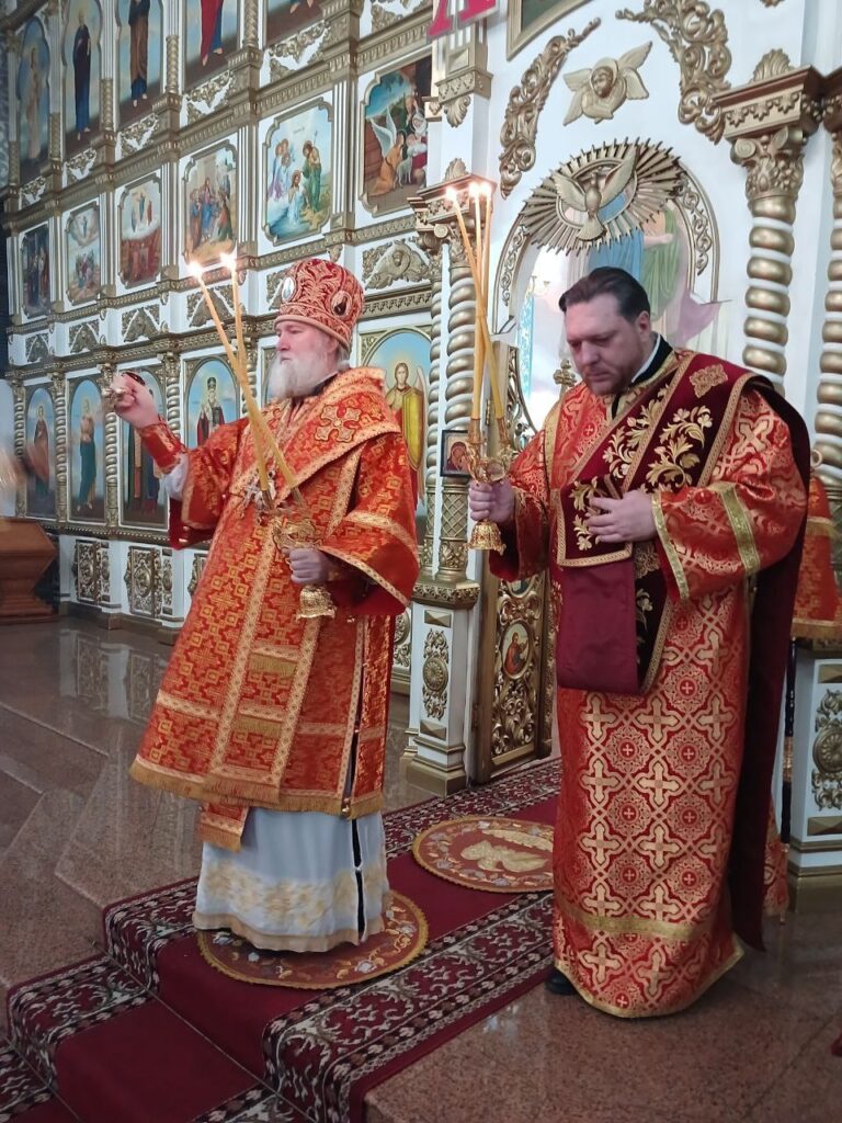 Его Преосвященству сослужили: и.о.благочинный церквей Актюбинского церковного округа, настоятель храма Архангела Михаила города Актобе иеромонах Киприан (Дахно), настоятель храма святого равноапостольного князя Владимира протоиерей Димитрий Соловьёв, настоятель храма в честь преподобного Серафима Саровского города Хромтау протоиерей Михаил Степанов, настоятель Свято — Троицкого храма города Алга иерей Виктор Яцко, ключарь Свято-Никольского собора иерей Леонид Худяков, клирик Свято-Никольского собора и настоятель храма иконы Божией Матери «Умягчение злых сердец» посёлка Мартук иерей Владимир Волощук, клирики собора иерей Роман Сайтиев, секретарь епархии иерей Борис Фатеев, диакон Сергий Мешков.