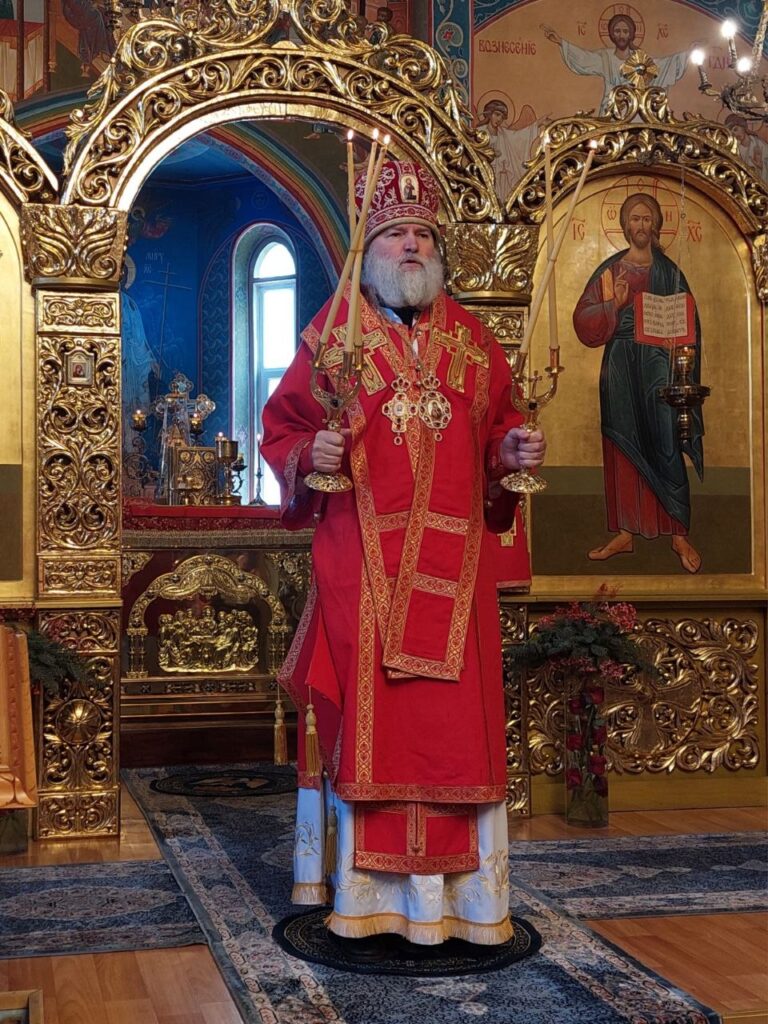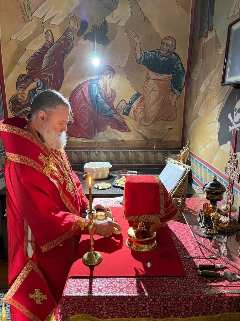 Его Преосвященству сослужил личный секретарь, клирик епархиального подворья иеромонах Амвросий (Дудонов).