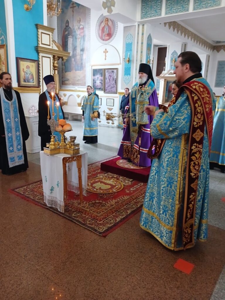 На великой вечерне по церковному Уставу была совершена лития (усиленное моление) с освящением хлеба, вина, пшеницы и елея (масла).