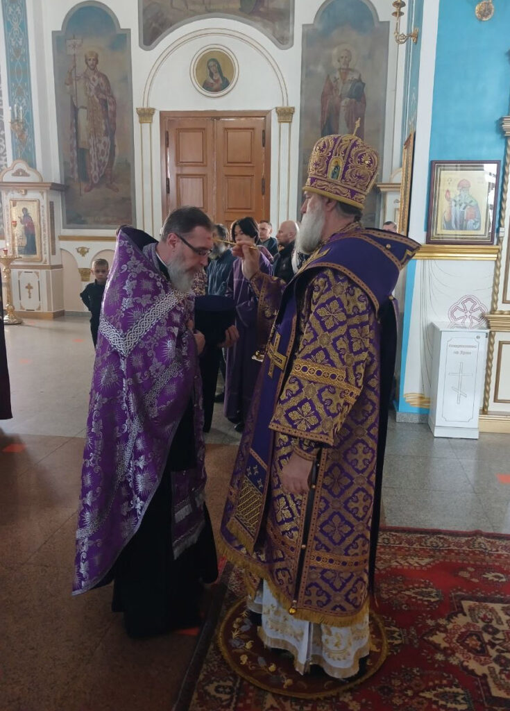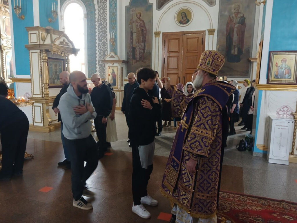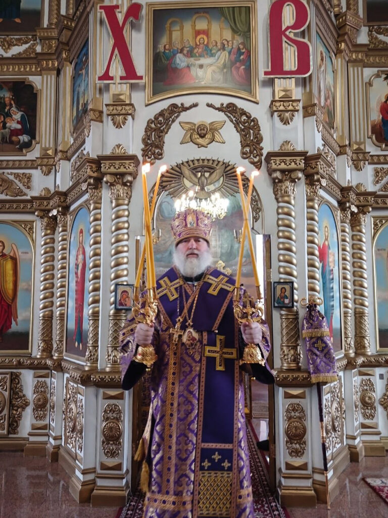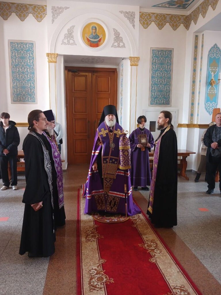Управляющему епархии сослужили: клирики собора иерей Леонид Худяков, иерей Роман Сайтиев, секретарь епархии иерей Борис Фатеев, диакон Сергий Мешков.