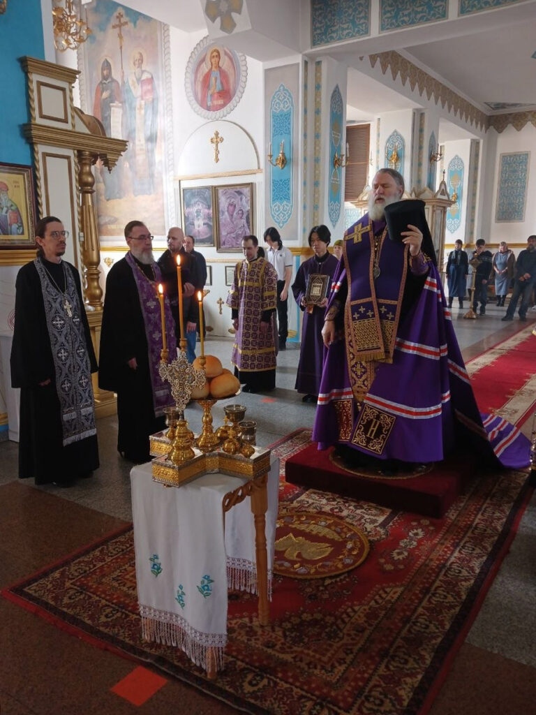 21 марта 2026 года – накануне Недели 4-ей, Крестопоклонной епископ Актюбинский и Кызылординский Игнатий совершил всенощное бдение в Свято-Никольском кафедральном соборе города Актобе.