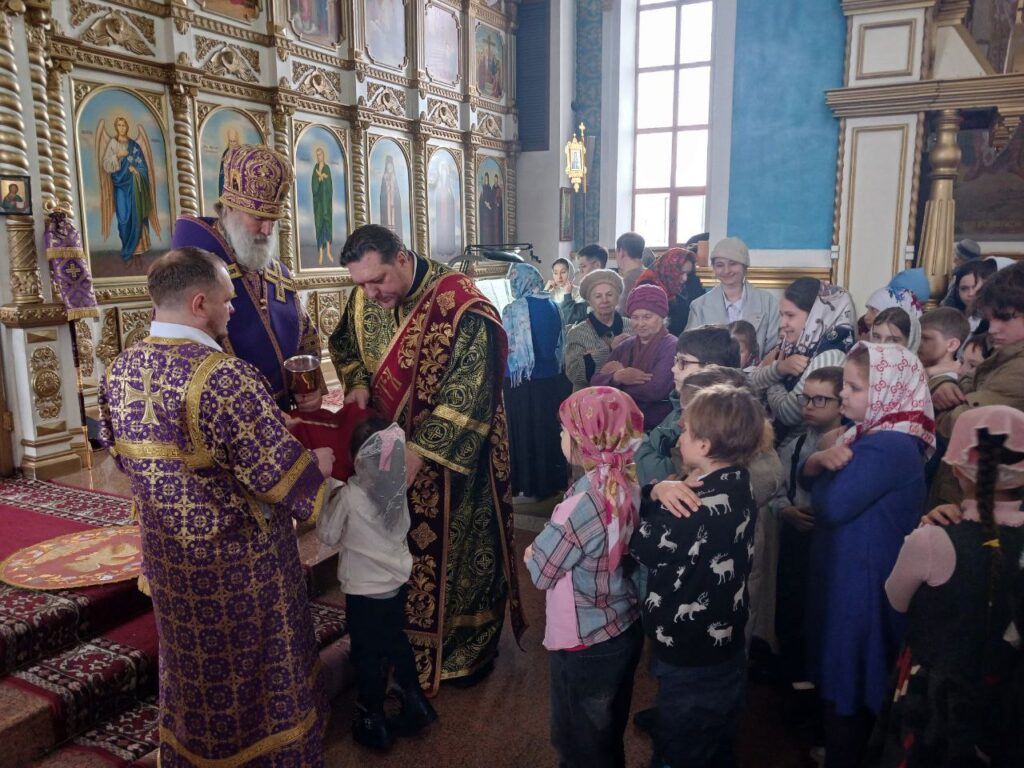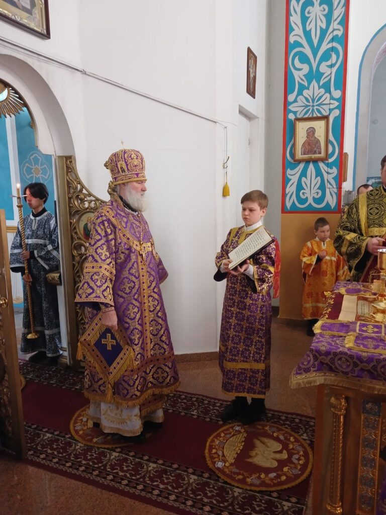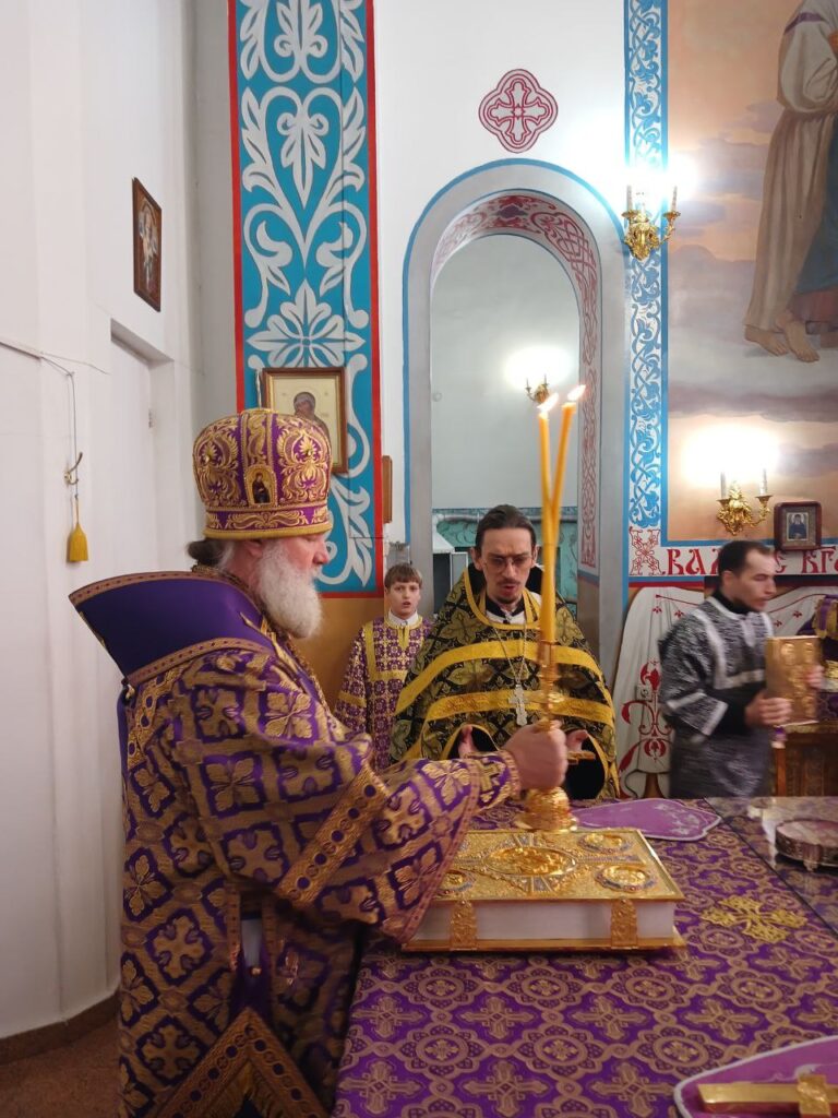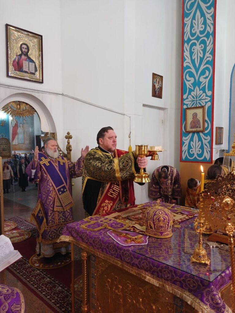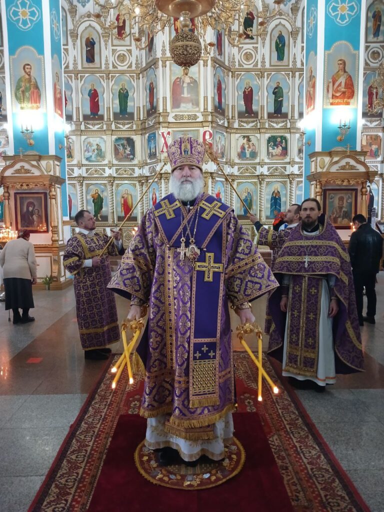 Его Преосвященству сослужили: ключарь собора иерей Леонид Худяков, руководитель отдела по социальной работе иерей Роман Сайтиев, секретарь епархии иерей Борис Фатеев, диакон Сергий Мешков.