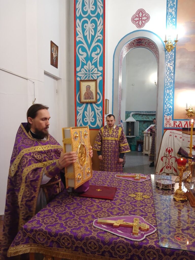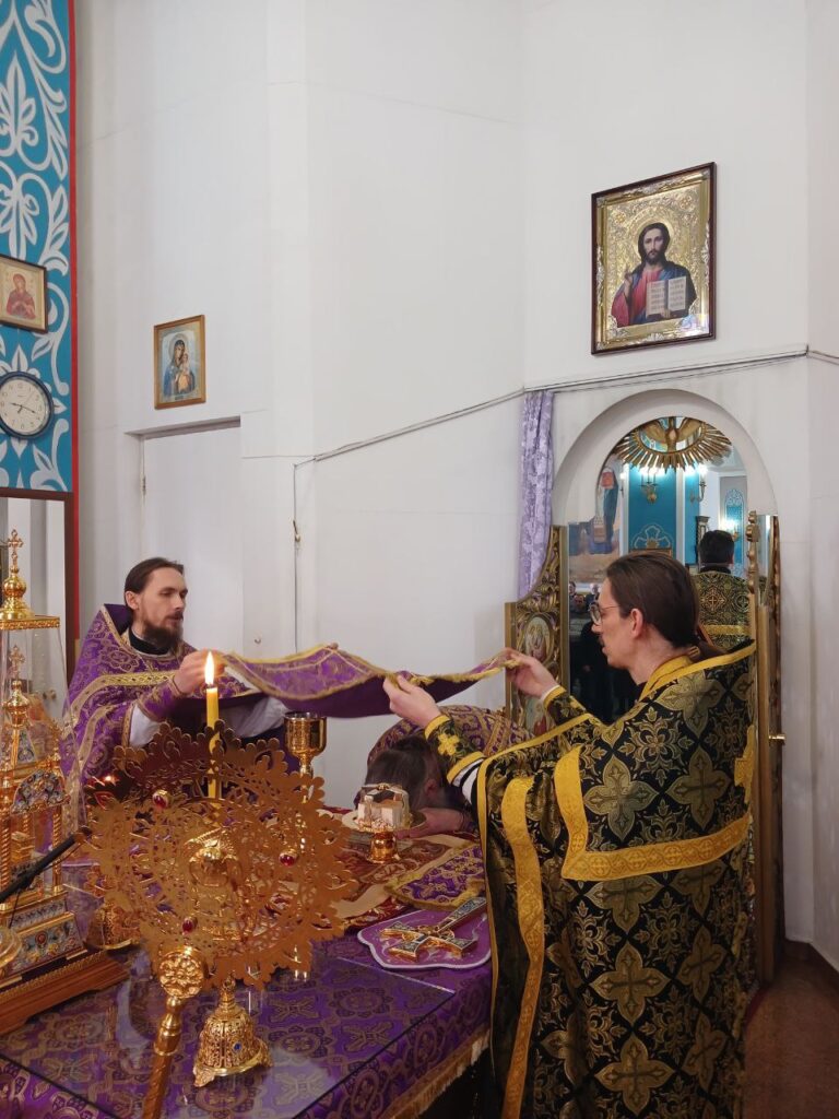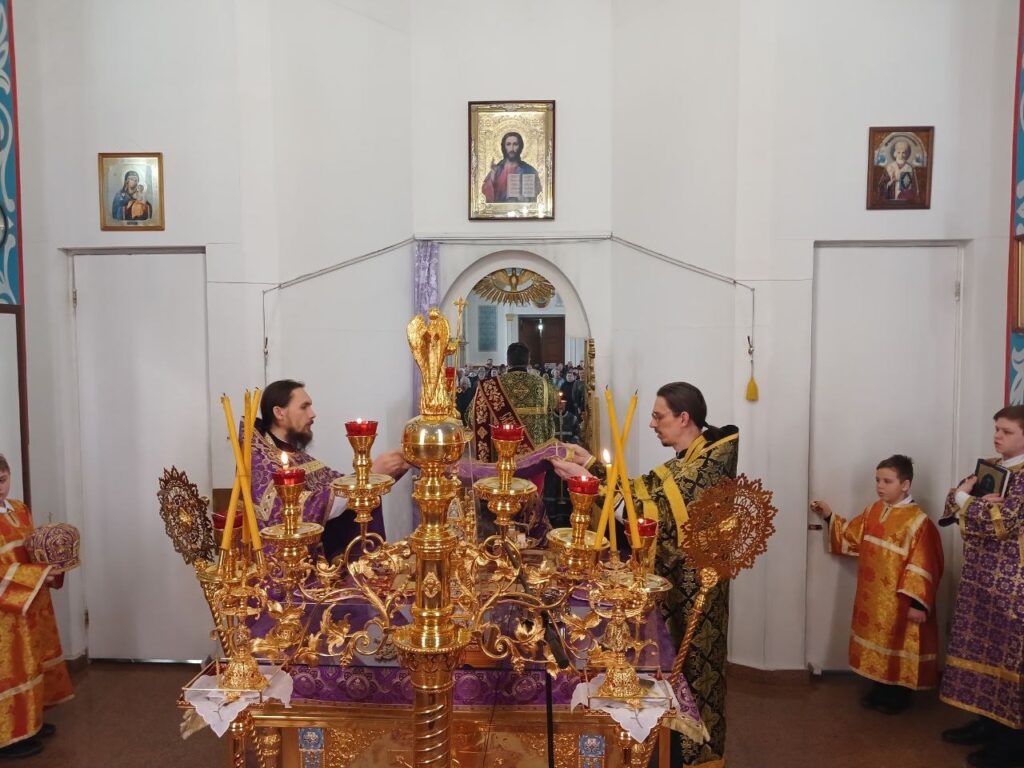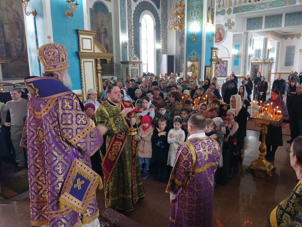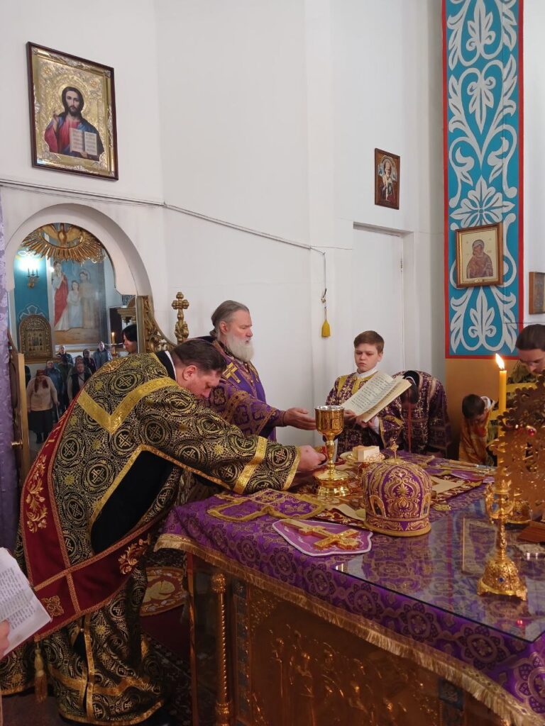 Его Преосвященству сослужили: ключарь собора иерей Леонид Худяков, руководитель отдела по социальной работе иерей Роман Сайтиев, секретарь епархии иерей Борис Фатеев, диакон Сергий Мешков.