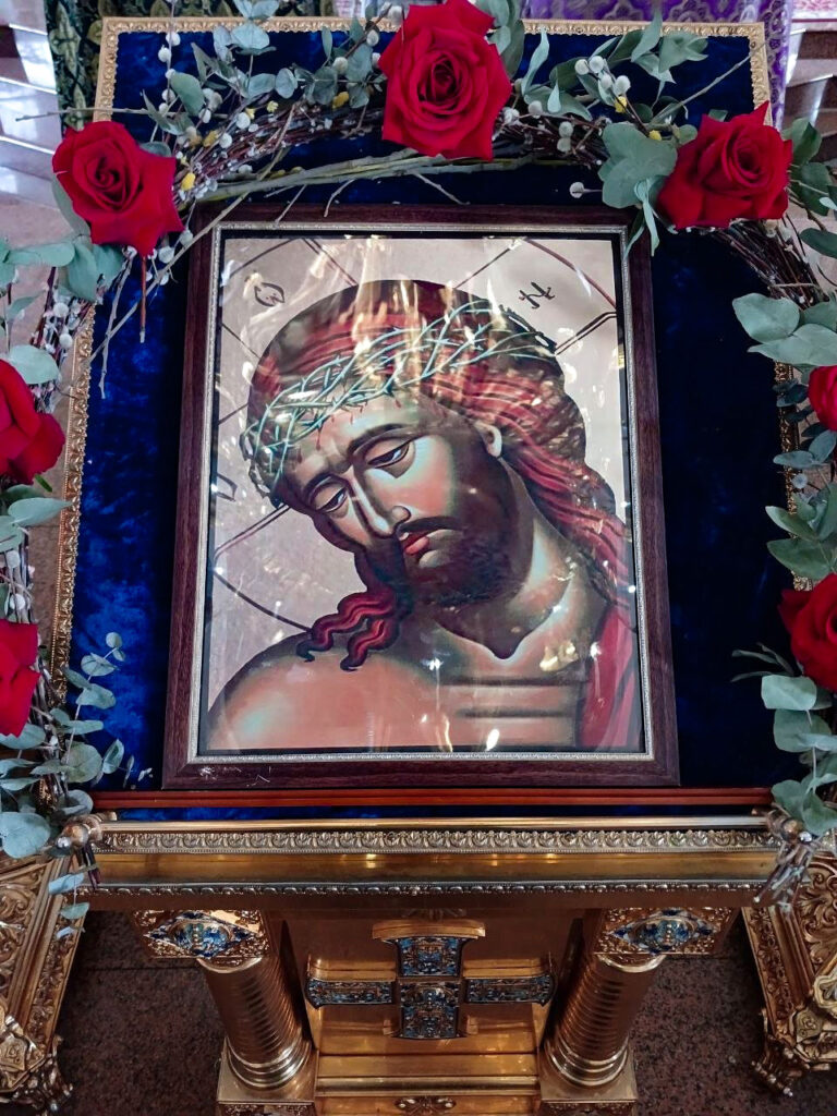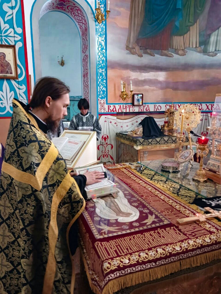 При пении тропарей «Благообразный Иосиф…», и возженных свечах, каждении фимиамом, с Престола, как бы с Голгофы, было изнесено из алтаря изображение положения Христа во гроб – святая Плащаница. Полотно с иконой погребения Спасителя было возложено на украшенной цветами символической гробнице в центре храма.