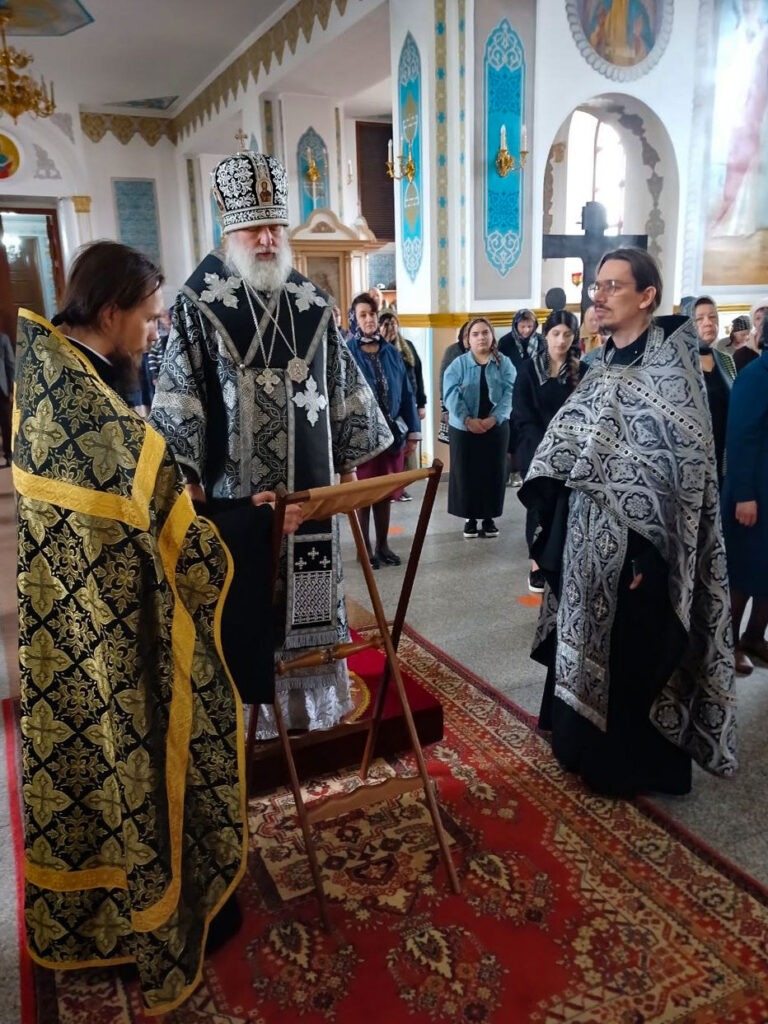 Архипастырю сослужили: клирики собора: иерей Леонид Худяков, иерей Роман Сайтиев, секретарь епархии иерей Борис Фатеев, диакон Сергий Мешков.