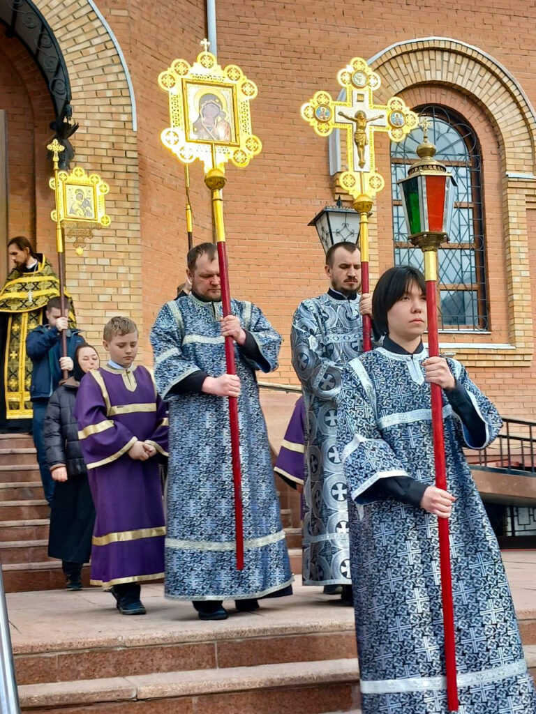 Под пение Трисвятого, Плащаница была обнесена крестным ходом вокруг храма, в воспоминание сошествия Господа Иисуса Христа во ад и победы Его над смертью.