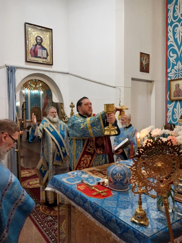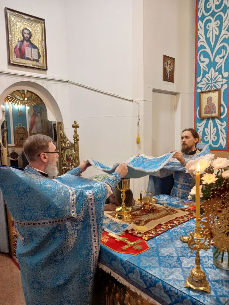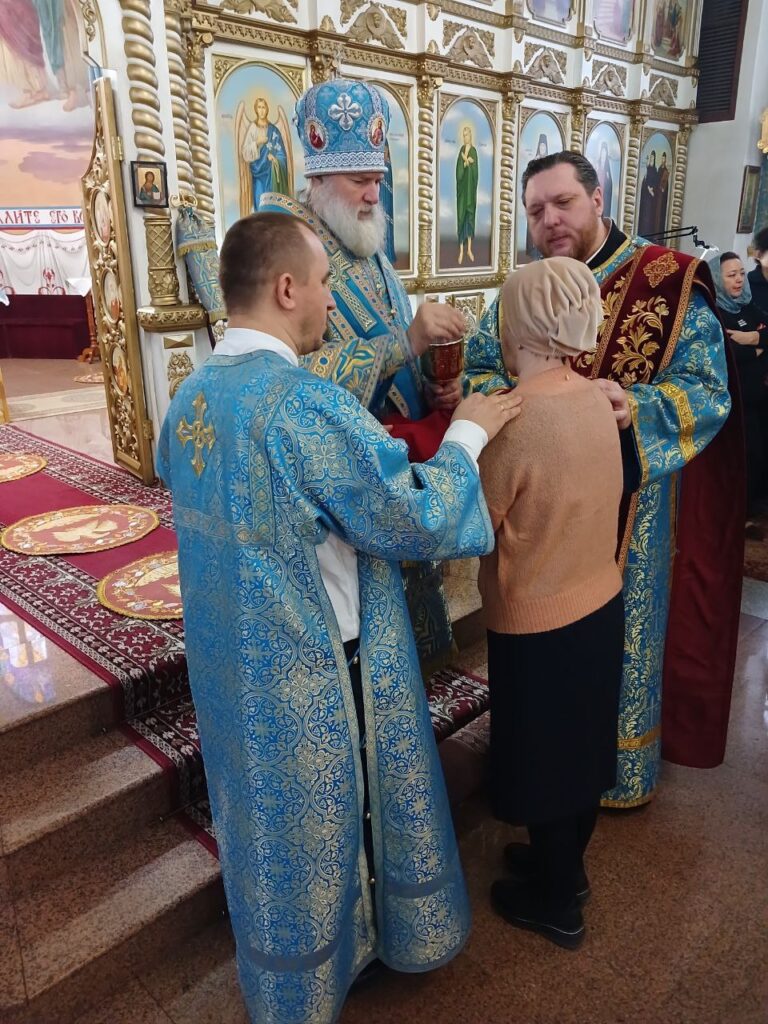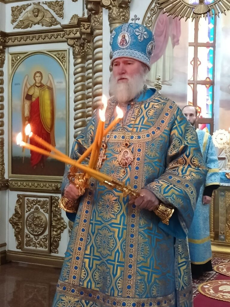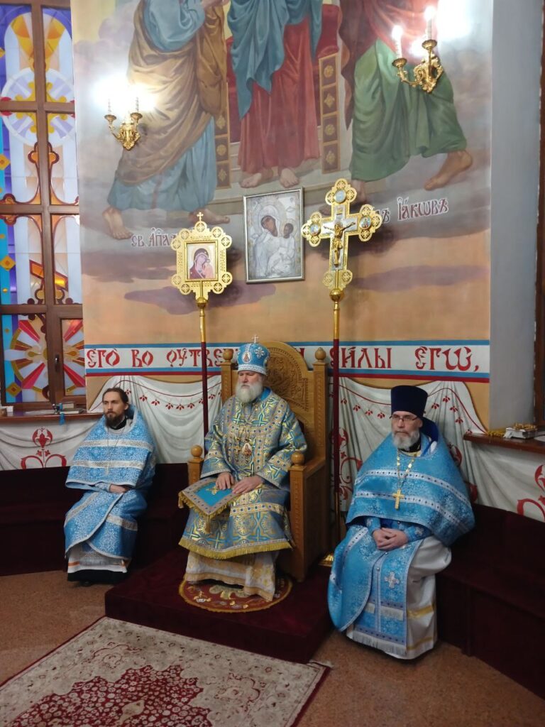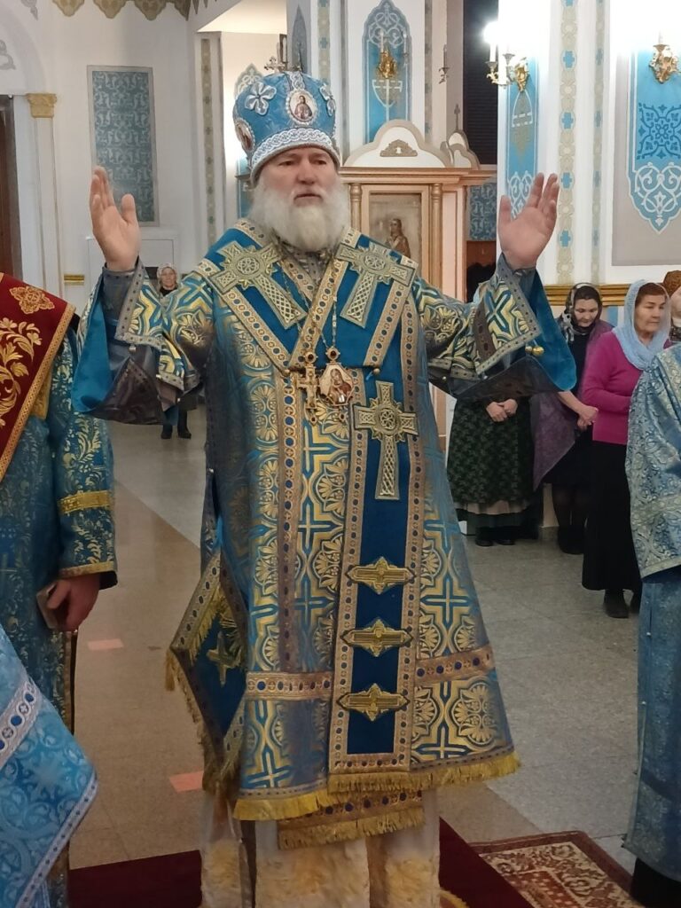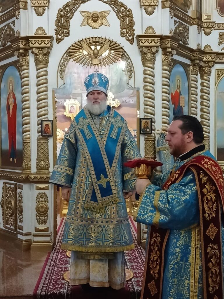 Преосвященному владыке сослужили: ключарь собора иерей Леонид Худяков, иерей Роман Сайтиев, диакон Сергий Мешков.