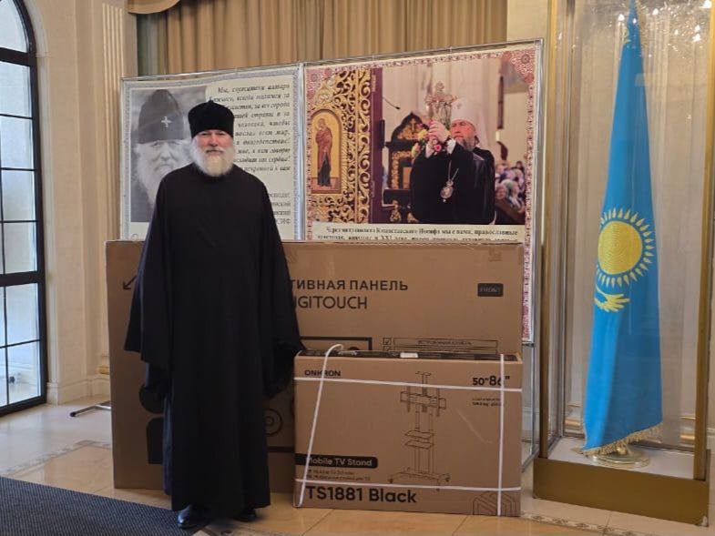 В ходе общения епископу Игнатию для воскресной школы Свято-Никольского кафедрального собора города Актобе была передана в дар интерактивная панель DigiTouch и стойки для использования панели при проведении занятий.